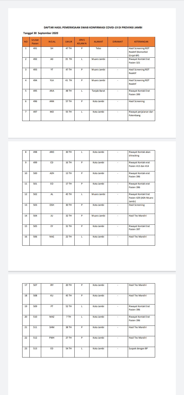 Berikut Identitas pasien positif Corona di Provinsi Jambi: