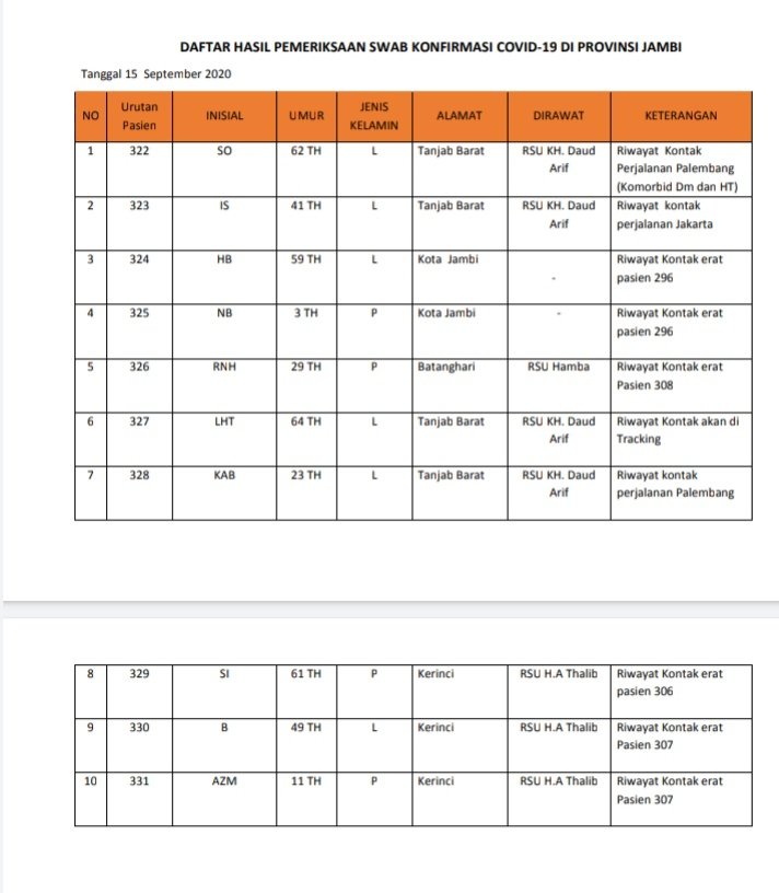 Berikut data dan identitas pasien terkonfirmasi positif Covid-19 di Jambi berdasarkan hasil uji swab Selasa 15 September 2020.
