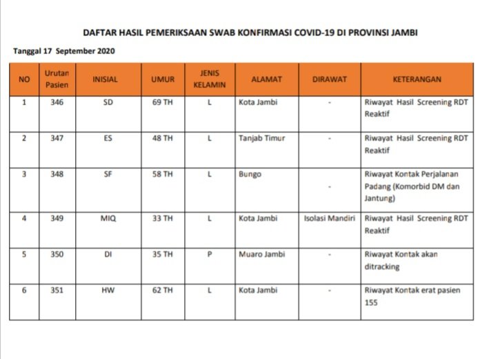 6 tambahan pasien positif tersebut berasal dari Kota Jambi, Kabupaten Tanjab Timur, Bungo dan Muarojambi.
