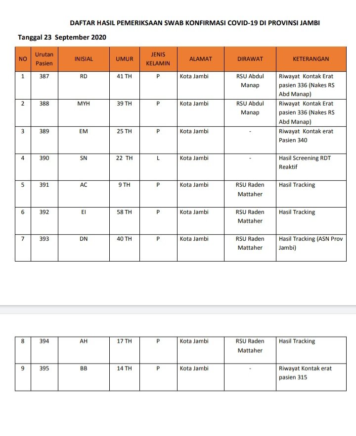 Berikut data dan identitas pasien terkonfirmasi positif: