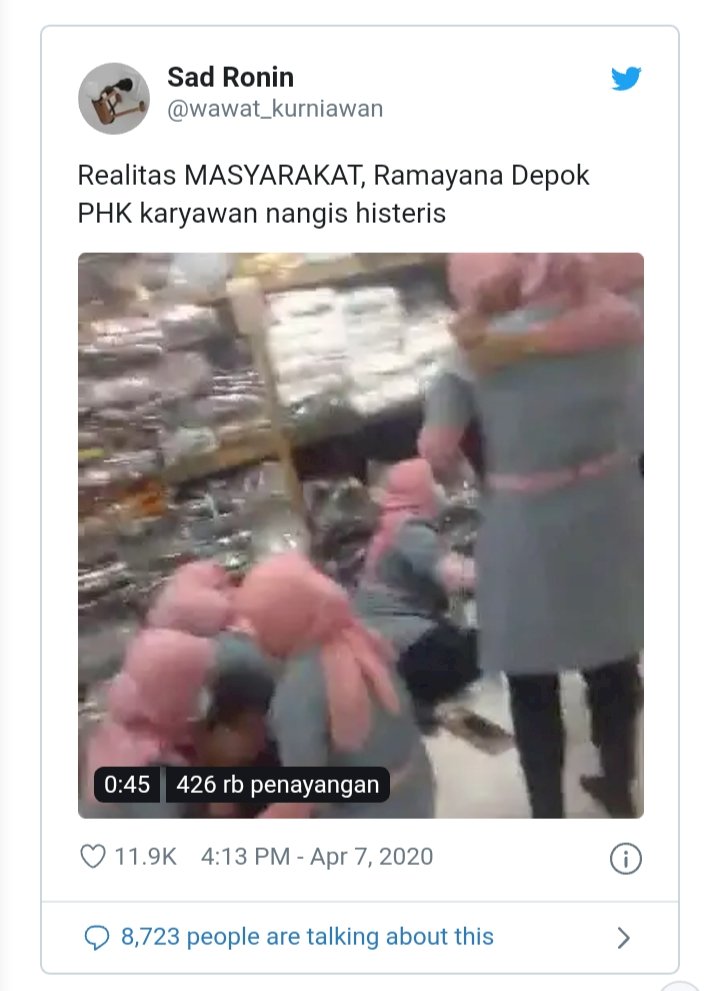 Santernya kabar PHK tersebut karena viral di sosial media Twitter yang salah satunya diunggah oleh @wawat_kurniawan. Video berdurasi sekitar 1 menit 19 detik itu menampilkan tangis haru para pegawai Ramayana yang berseragam biru dan merah muda.